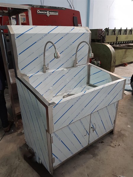 Bồn rửa tay tiệt trùng 2 vòi dạng hộp, phù hợp cho thao tác rửa tay tiệt trùng, phía dưới gầm đặt bộ xử lý tiệt trùng.