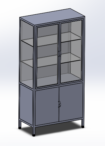 - Phần trên có 2 kệ chia thành 3 ô bằng kính trắng dày 5mm, 2 bên hong và cửa kính dày 5mm, cánh cửa có khung vuông 20x20mm